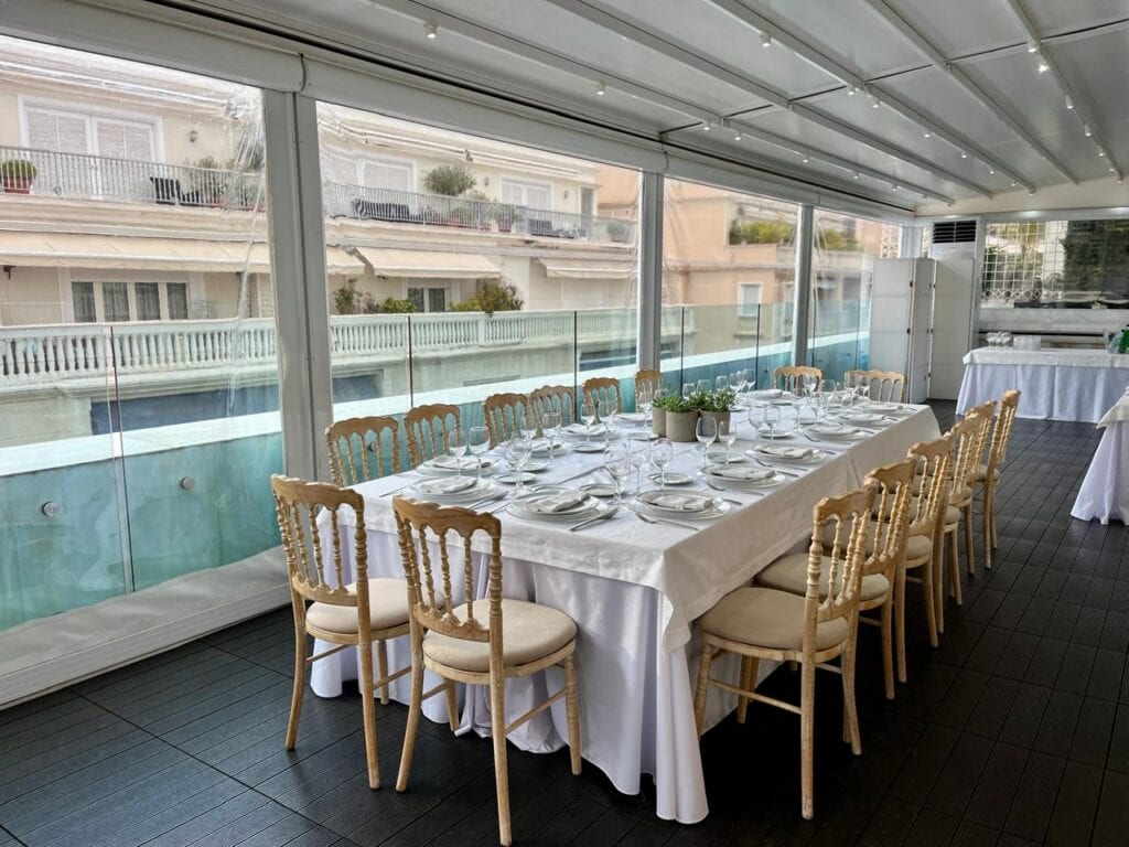 Παράλληλα, διαθέτει εξωτερικό χώρο ο οποίος προστατεύεται από τις καιρικές συνθήκες, κλιματίζεται αυτόνομα και είναι κατάλληλος να εξυπηρετήσει υπηρεσίες catering όπως welcome coffee/coffee breaks ή δεξίωση κοκτέιλ.