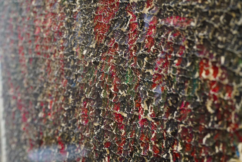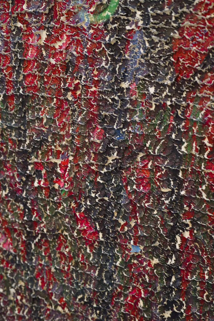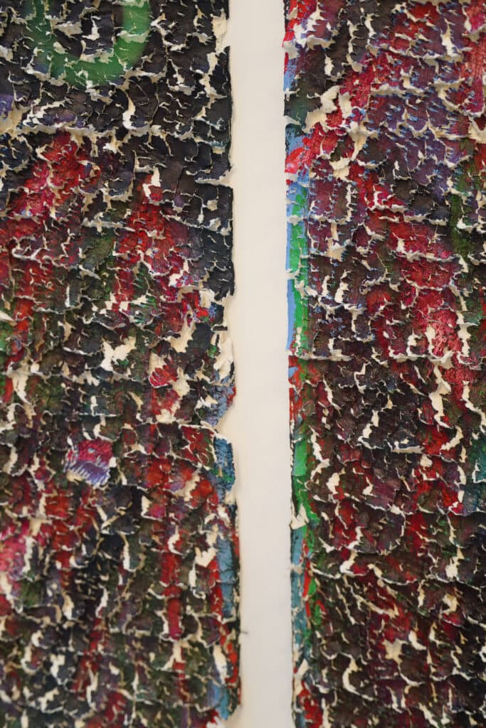 Η πορεία από το αρχικό στάδιο προς την ολοκλήρωση του έργου, αναπτύσσεται πολυαισθητηριακά μέσα από τη συνύφανση της οπτικής παραγωγής της μορφής και της απτικής δράσης πάνω στο υλικό. Το χαρτί πάλλεται από τη γλυπτική χειρονομία του σμιλεύματος και παράλληλα φτάνει στα όρια της φθοράς του.