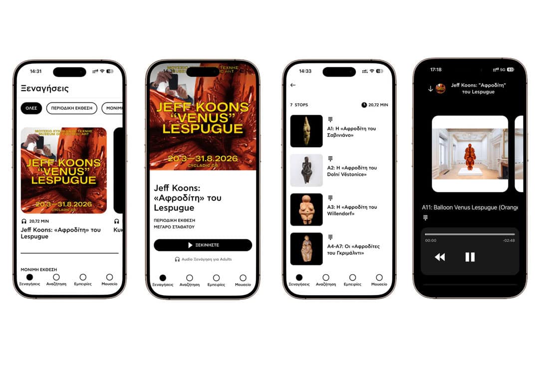 Το Μουσείο Κυκλαδικής Τέχνης παρουσιάζει την έκθεση Jeff Koons: «Αφροδίτη» του Lespugue, μια πρωτότυπη μουσειακή πρόταση που φέρνει σε διάλογο την παλαιολιθική τέχνη με τη σύγχρονη τέχνη. Εξερευνώντας τη σημασία της μορφής της Αφροδίτης από την Παλαιολιθική περίοδο μέχρι σήμερα, το Μουσείο παρουσιάζει για πρώτη φορά στο κοινό το έργο του διεθνώς αναγνωρισμένου Αμερικανού καλλιτέχνη Jeff Koons Balloon Venus Lespugue (Orange) (2013-2019) από τη Συλλογή Homem Sonnabend των Antonio Homem Sonnabend και Phokion Potamianos Homem, σε διάλογο με δέκα παλαιολιθικές «Αφροδίτες», μέσα από πιστοποιημένα αντίγραφα των αμετακίνητων πρωτοτύπων που φυλάσσονται σε μεγάλα ευρωπαϊκά μουσεία. Η έκθεση διερευνά τη γυναικεία μορφή από την Παλαιολιθική περίοδο έως τη σύγχρονη τέχνη, προτείνοντας ένα διάλογο που εκτείνεται σε περισσότερα από 40.000 χρόνια ανθρώπινης δημιουργίας.