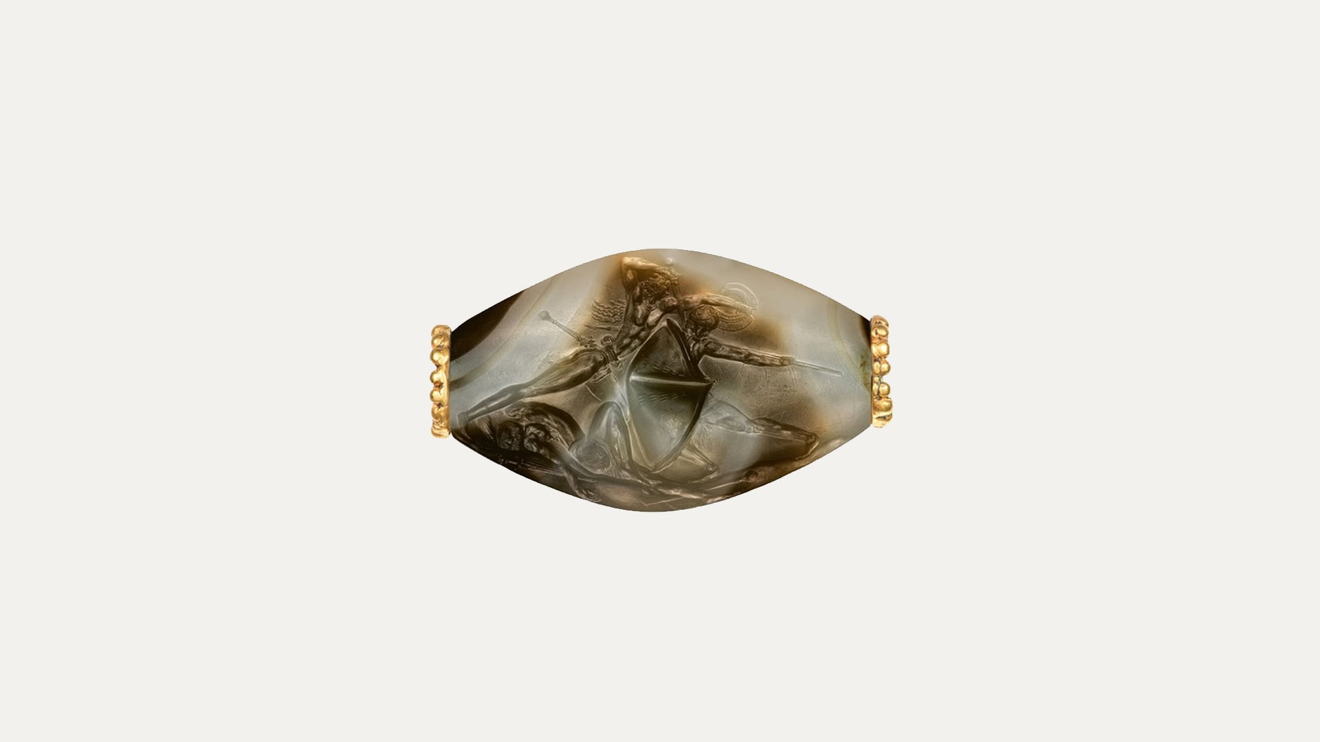© Palace of Nestor Excavations, The Department of Classics, University of Cincinnati, P. 98, cat. no. 33: Sealstone with a Battle Scene (The Pylos Combat Agate).