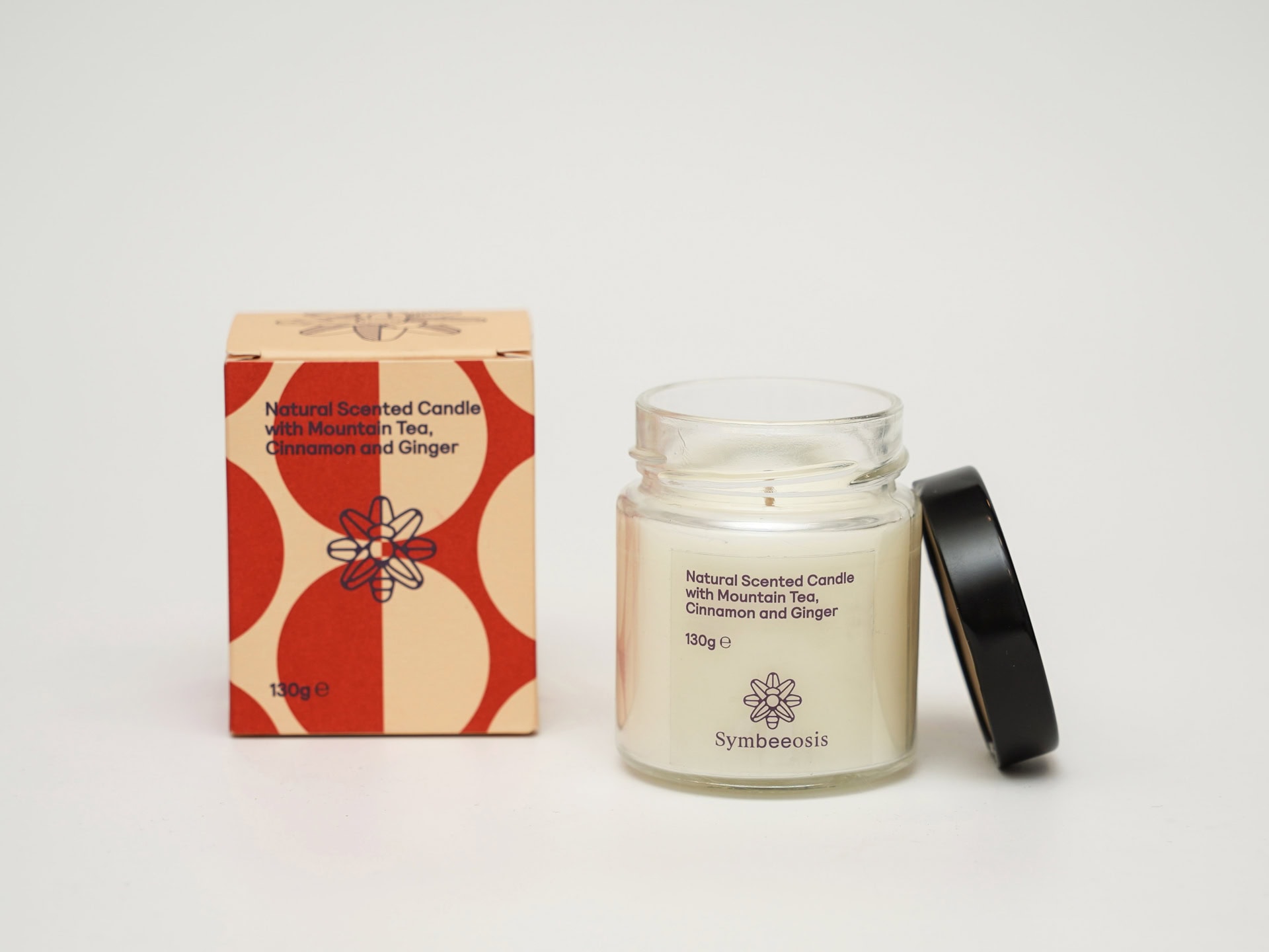 Φυτικό αρωματικό κερί από Symbeeosis σε γυάλινο βάζο, κατασκευασμένο από 100% φυσικό κερί σόγιας και φυτίλι βαμβακιού χωρίς μόλυβδο. Ένας ξεχωριστός συνδυασμός που συνδυάζει τη φρεσκάδα του τσαγιού του βουνού με τη ζεστασιά της κανέλας και την πικάντικη αίσθηση του τζίντζερ. Καίγεται αργά και ομοιόμορφα, χωρίς εκπομπές αιθάλης, προσφέροντας ένα πλούσιο ζεστό άρωμα που θα γεμίσει το χώρο σας ζεστασιά και γιορτινή διάθεση.