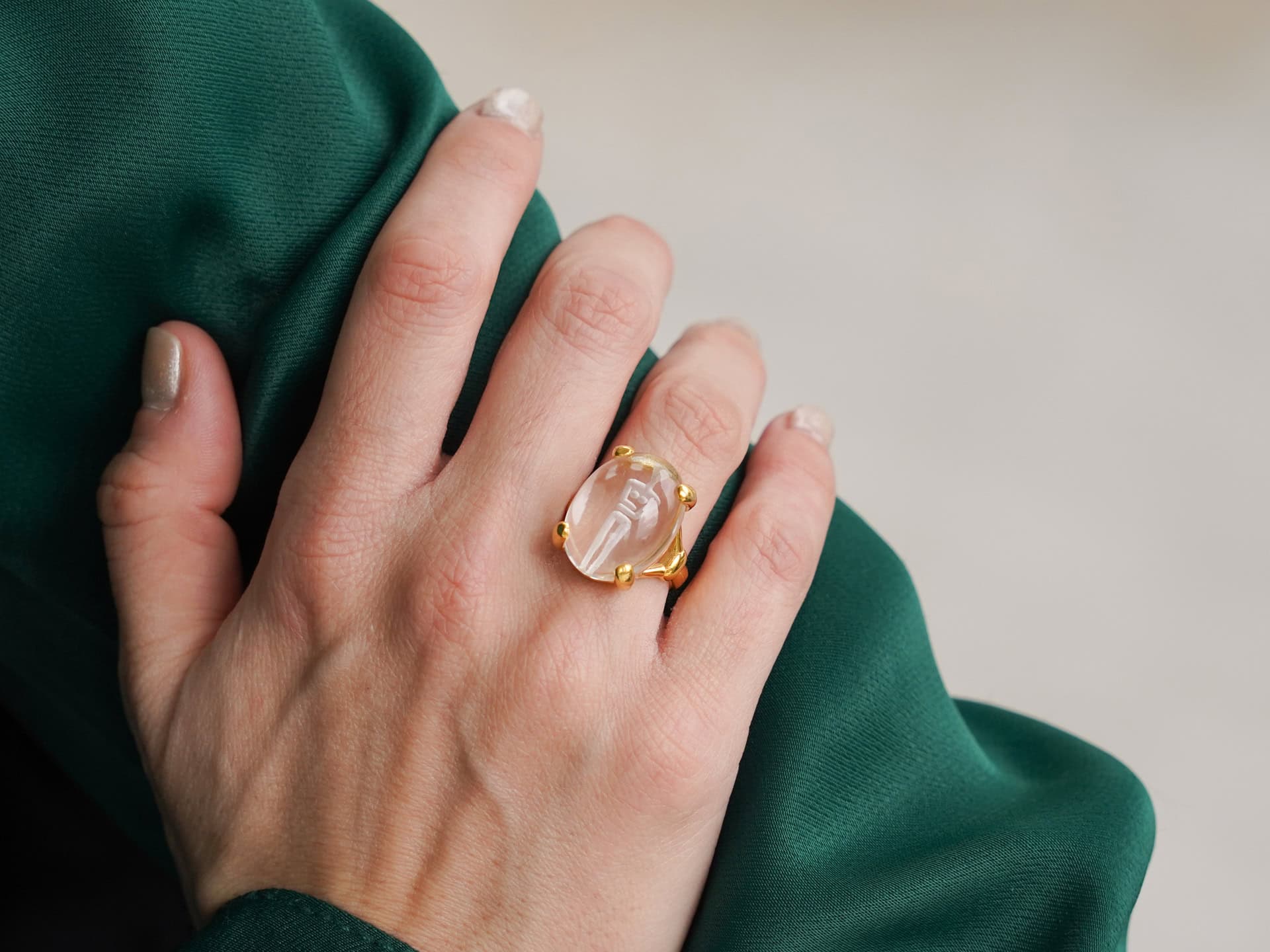 Επίχρυσο δαχτυλίδι από ορεία κρύσταλλο με κυκλαδικό ειδώλιο.